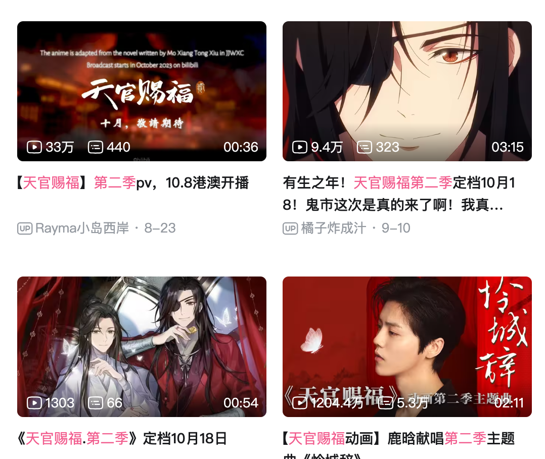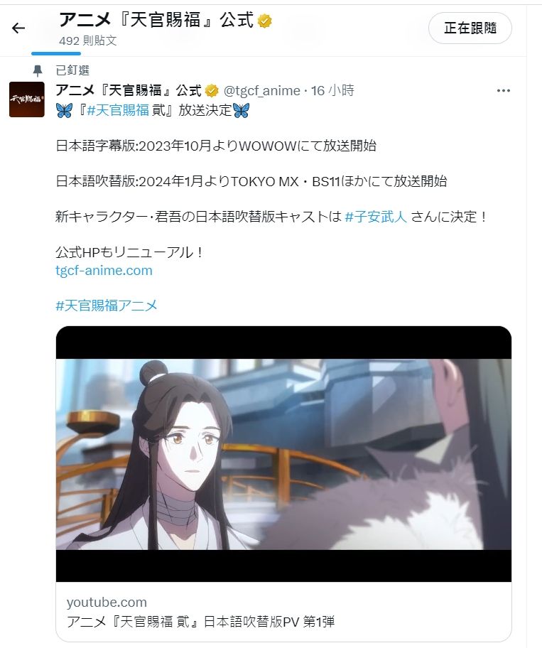 YouTube官方频道影片长度37秒,多了字幕宣布10月将播出第2季,且日本官方推特,更直接公布10月播出《天官赐福二》日语字幕版,2024年1月日语配音版将在东京电视台播出,关键新角色“君吾”将由子安武人配音。