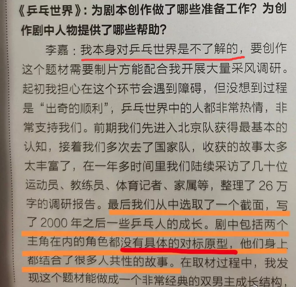 之前这部剧的编剧在采访的时候也有说过,他本身对乒乓世界并不是很了解,后面去北京队、国家队调研,收获了很多故事,他还强调两位男主没有具体的对标原型,因为他们身上结合了很多人的共性,这也是为什么除了马龙、张继科,两位男主身上还有其他球员影子的原因。
