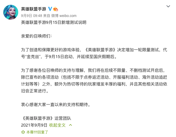 9月3日,在英雄联盟十周年庆典上,官方宣布英雄联盟手游将在9月15日开启不删档测试。