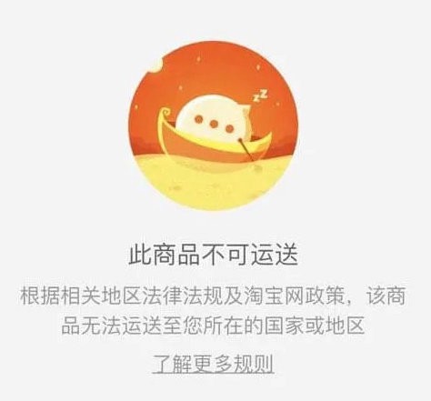淘宝如果判定你的 IP 地址在海外,则会根据海外物流配送【官方物流禁运品清单】大陆禁止出口收寄目录清单来做判断,如果你搜索的物品在此清单中,就会有上面的页面提醒。