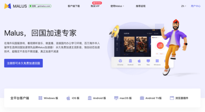 Malus加速器有iOS版、Android、Chrome插件、Windows、macOS、电视盒子TV版,各种设备都可以下载使用。注册下载即可领取试用。