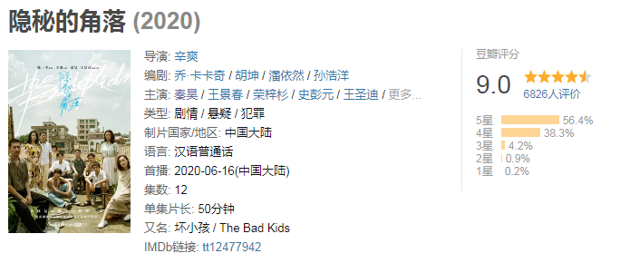 《隐秘的角落》该剧改编自紫金陈推理小说《坏小孩》 ,讲述了沿海小城的三个孩子在景区游玩时无意拍摄记录了一次谋杀,他们的冒险也由此展开。扑朔迷离的案情,将几个家庭裹挟其中,带向不可预知的未来......