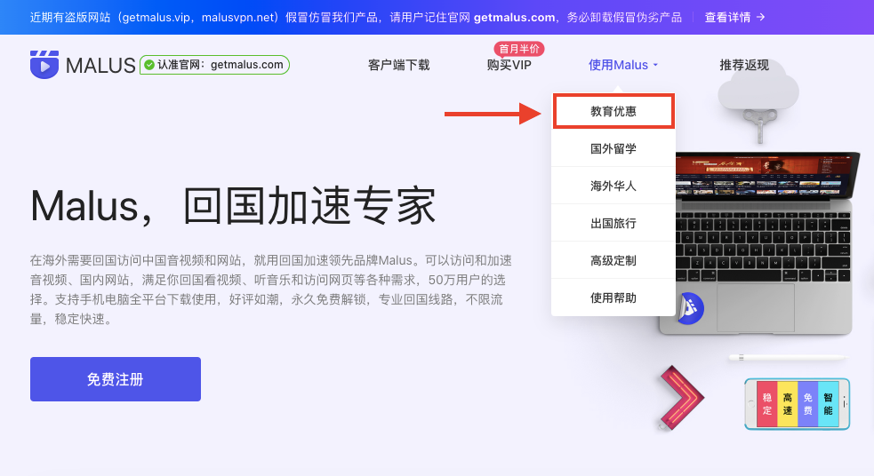 打开Malus官网,点击「使用Malus」内的「教育优惠」进入学生注册专用通道。