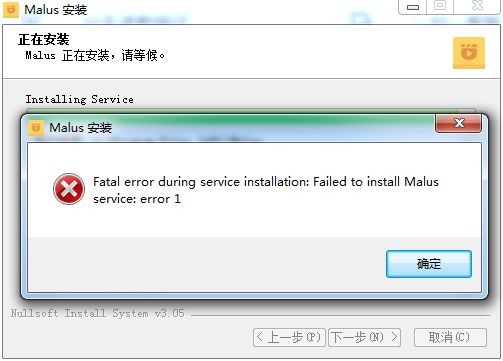 如果还是安装的时候报 "Failed to install Malus service: error 1"