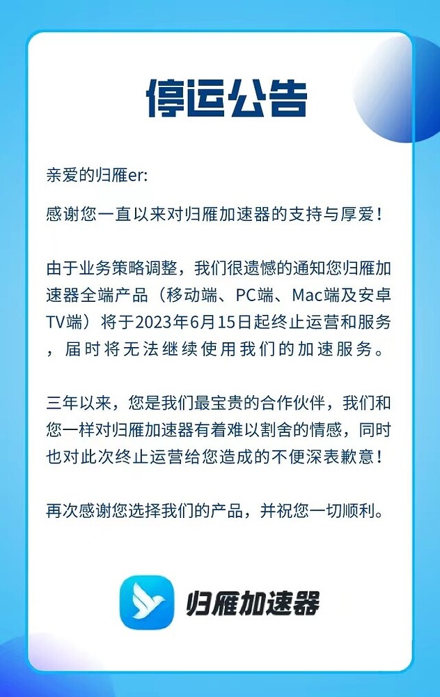 归雁加速器为什么停运?归雁加速器用不了?归雁不能用了?