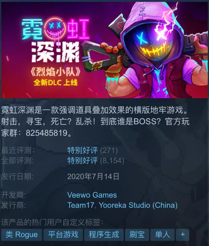 《霓虹深渊》之前在 Steam 平台上取得了相当出色的成绩,目前总销量已经突破 50 万大关,获得了“特别好评”的评价。