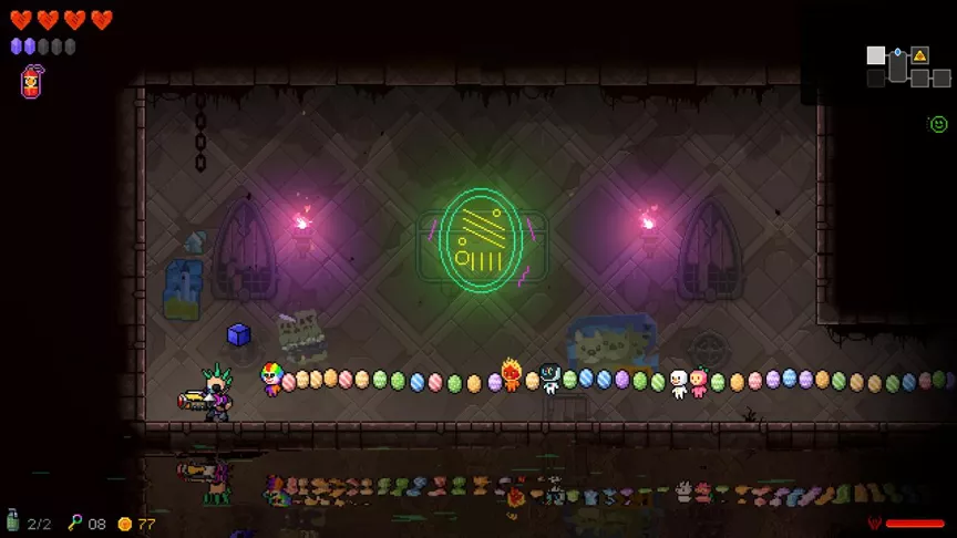 《霓虹深渊》的主要玩法是在平台跳跃的基础上,搭配弹幕射击的打法,然后持续进行一个搜刮地牢、收集装备、打败BOSS、自我升华的循环。