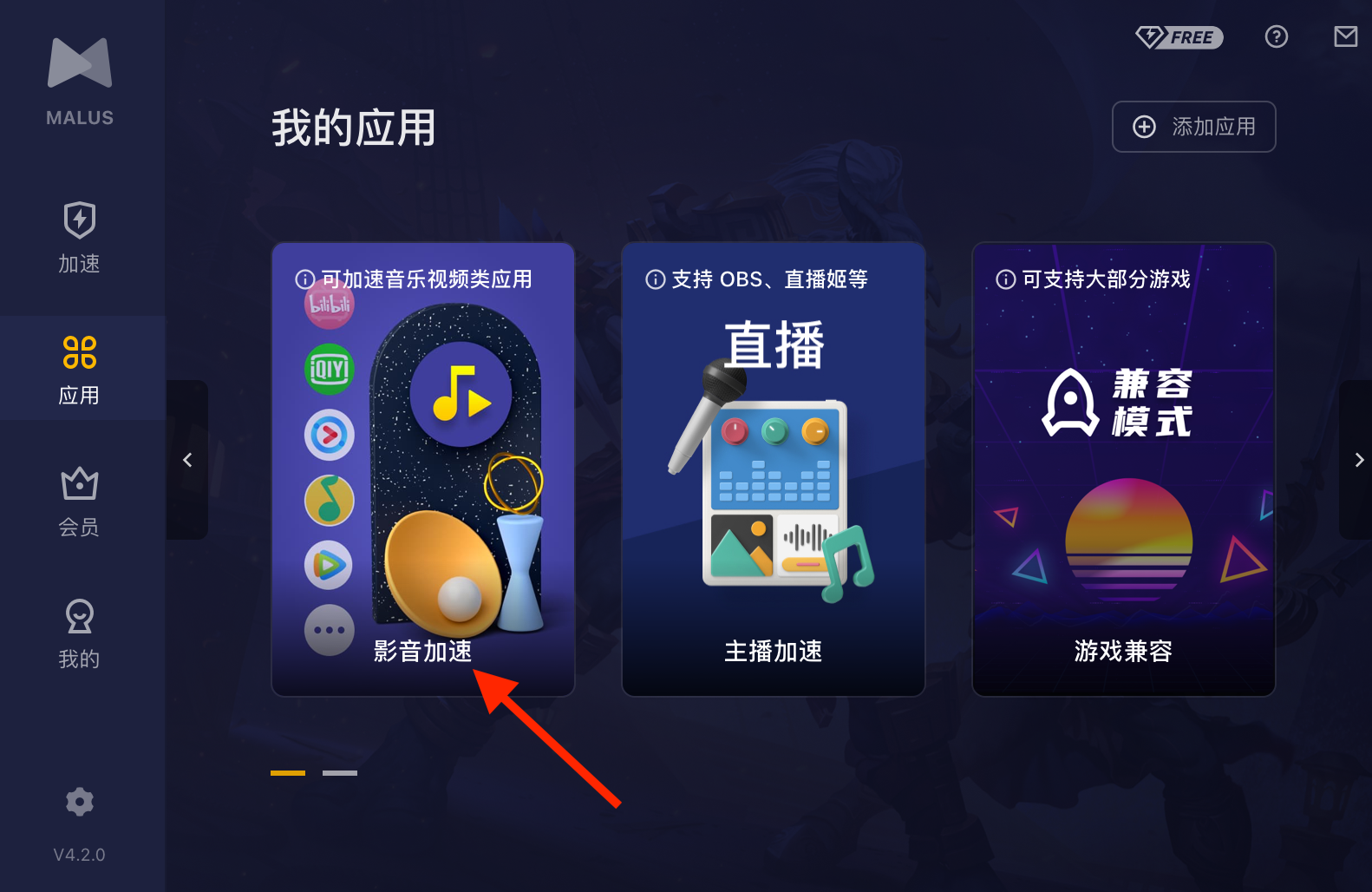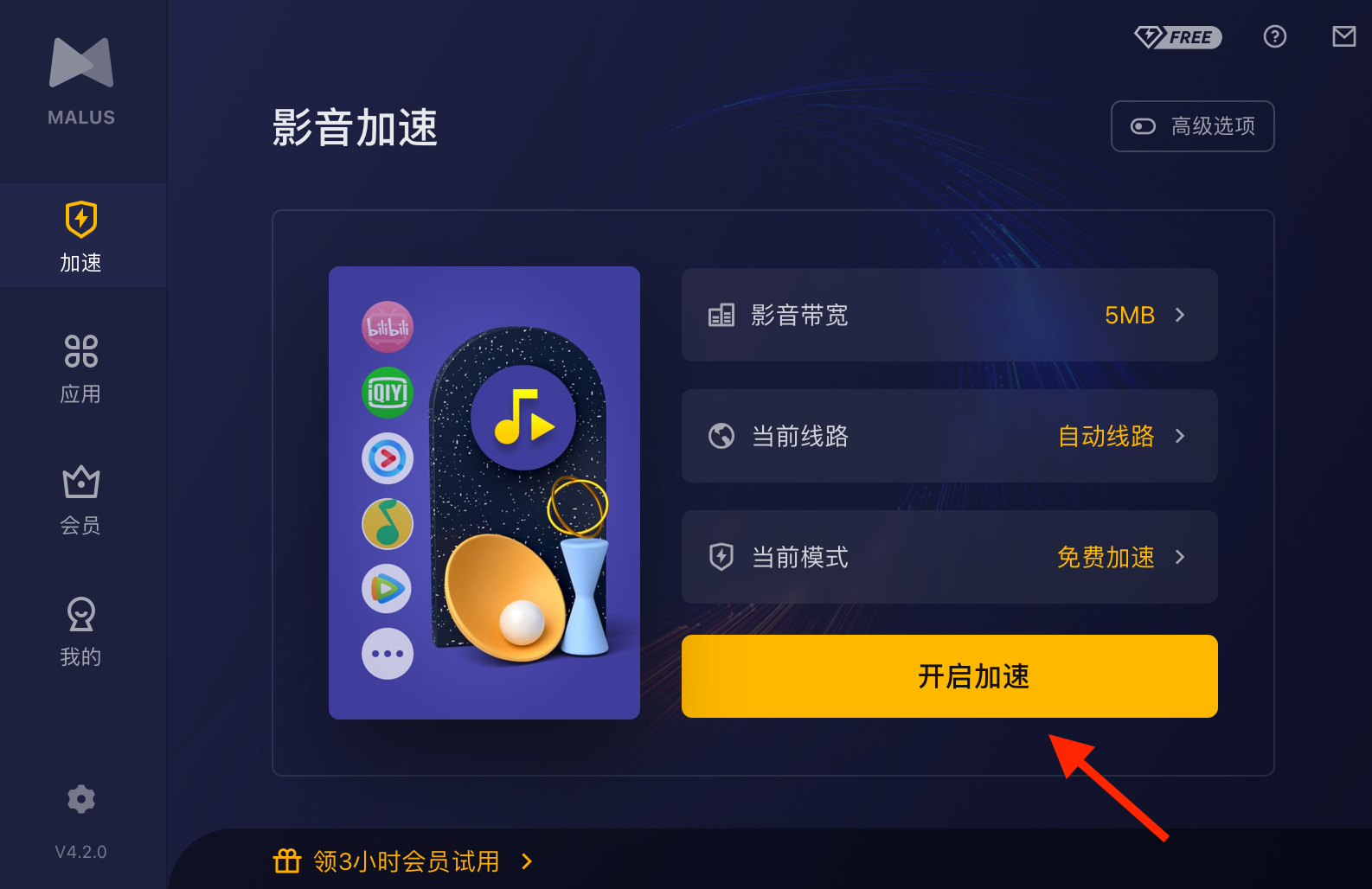 2.打开并登录Malus APP,选择应用库内的【影音加速】,点击【开始加速」,再打开抖音/CCTV5/咪咕视频/西瓜视频等,就可以在海外轻松回国观看卡塔尔世界杯直播了。