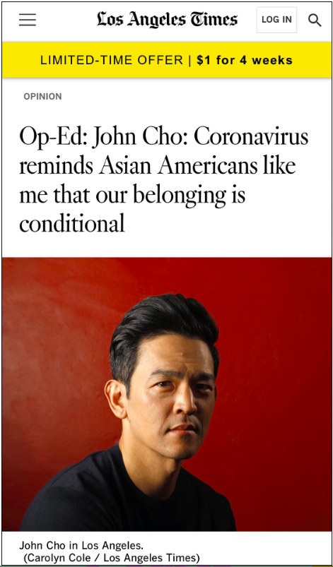 4月22日,他在《洛杉矶时报》(Los Angeles Times)上发表了一篇强有力的文章《新冠提醒在美亚裔,我们的归属感是有条件的》