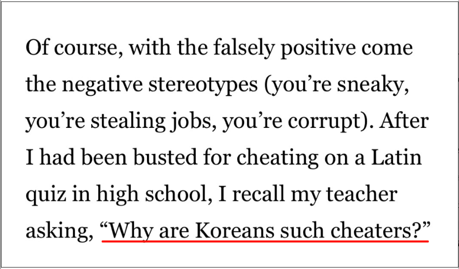当然,虚假的正面印象多了,负面的刻板印象也随之而来(你鬼鬼祟祟,你偷了本地人的饭碗,你腐败)。我上高中时在一次拉丁语考试中作弊被抓,记得当时老师问我:“为什么韩国人这么爱作弊?”