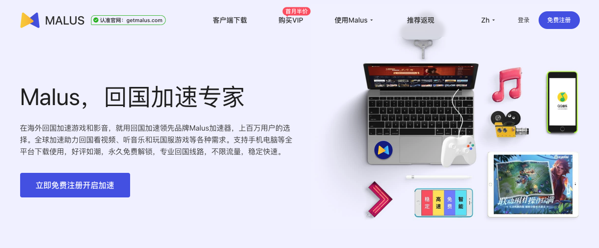 推荐使用Malus加速器,支持加速助力回国看视频、听音乐和玩国服游戏等各种需求。支持手机电脑等全平台下载使用。
