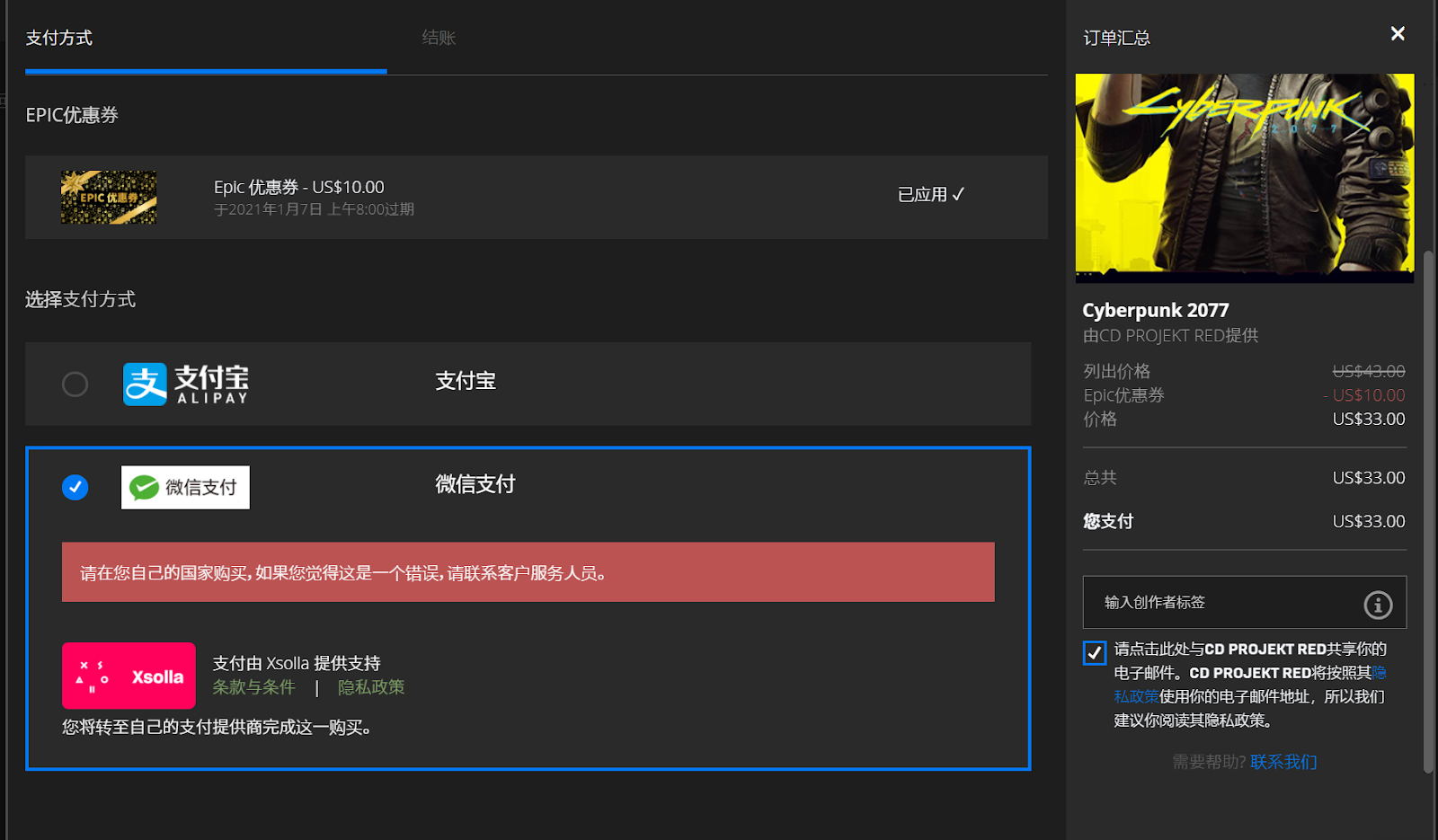 海外党如何在Epic国区付款,出现“请在你自己的国家购买”提示怎么办