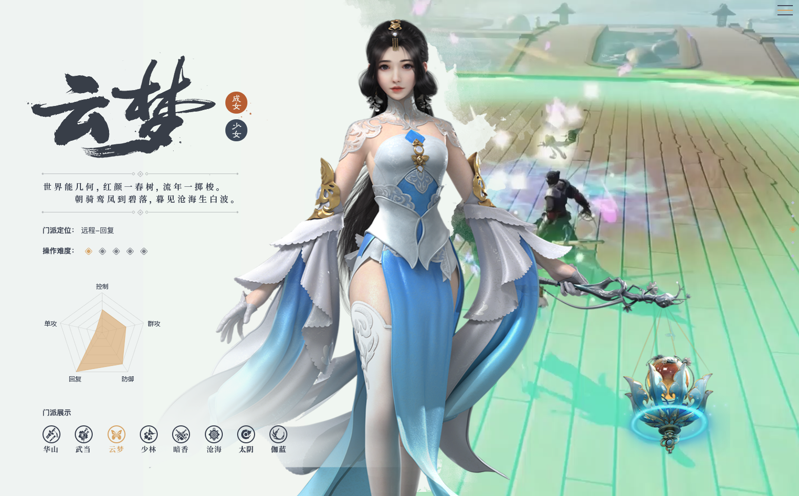 新生版以全新剧情冒险、全新门派、升级重制的美术效果等全面革新内容,带来一个更加自由恣肆的武侠世界,打造更美更真实的江湖。 玩家可选择扮演华山、武当、云梦、少林、暗香、沧海、太阴、伽蓝各门派角色。