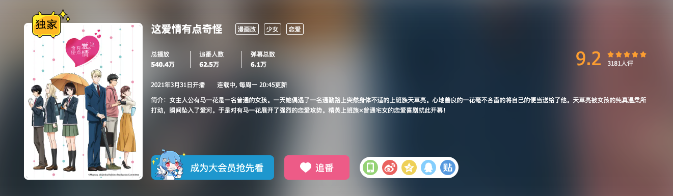 之前也给大家安利过,四月上线的番剧。但是,多数原本应该按照日本播出时间播放的番剧,没有同步播放出。像是四月新番《这爱情有点奇怪》日本3月29日开播,但是B站上线3月31日。