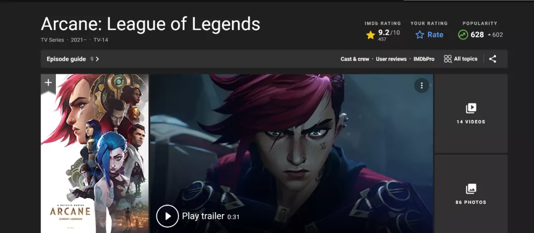 首日,国内豆瓣评分为9.2分,国外烂番茄就拿到了96分的高分,IMDB同样达到了9.2的高评分。据统计,《英雄联盟:双城之战》已超过《鱿鱼游戏》在Netflix收视率登顶,在37个国家/地区排名第一。