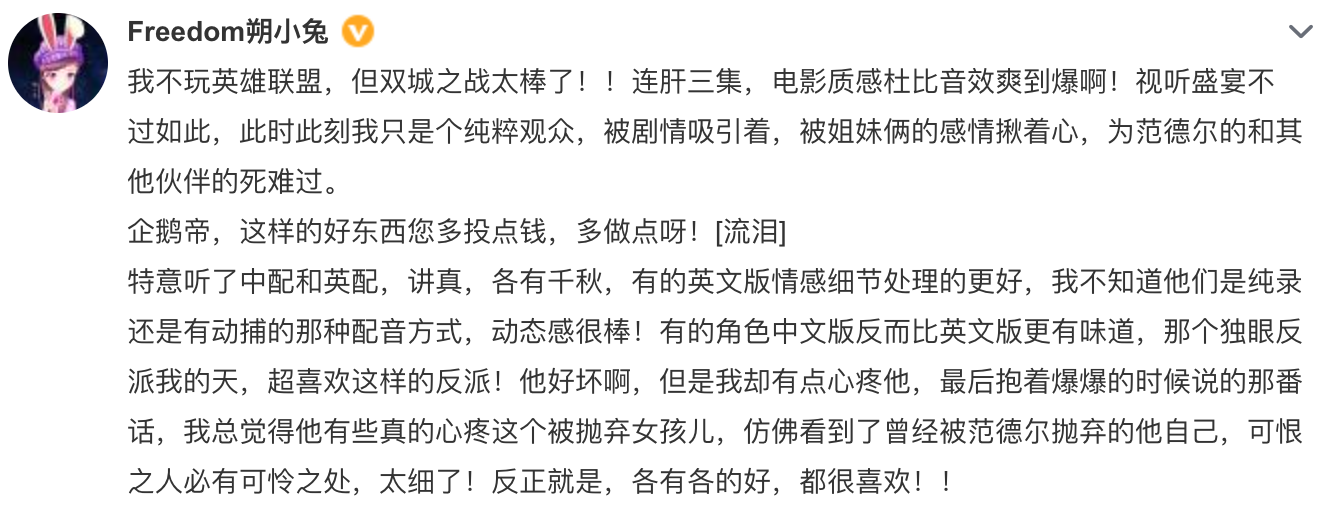 同时,《英雄联盟:双城之战》的中文配音表现的也非常优秀,可以说是国内动画配音的第一梯队。