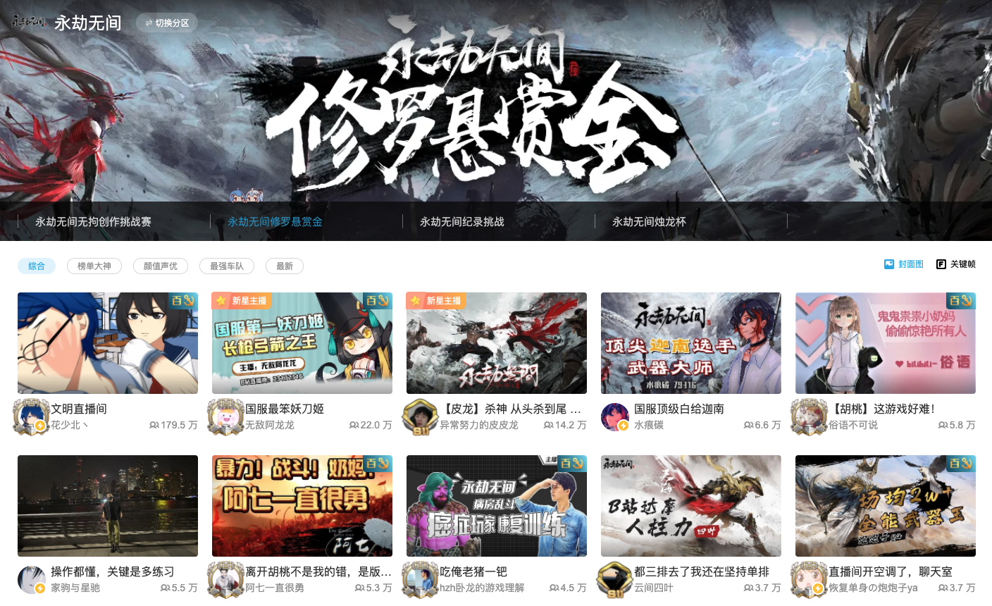 在各大直播平台,《永劫无间》已经成为了横扫一切的存在:斗鱼热度长期维持在4000万左右,动辄霸榜热搜,PDD、YYF、寅子等头部主播都是其死忠粉;B站则有多位百大UP主中国BOY、花少北、KB呆又呆等爆肝直播。