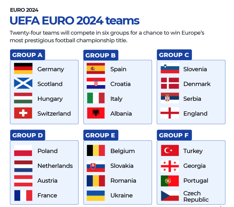 本次赛事共有24支球队分为6个小组参加比赛,总共51场比赛。小组赛将持续到6月26日,16支球队的淘汰赛将于6月29日星期六开始。
