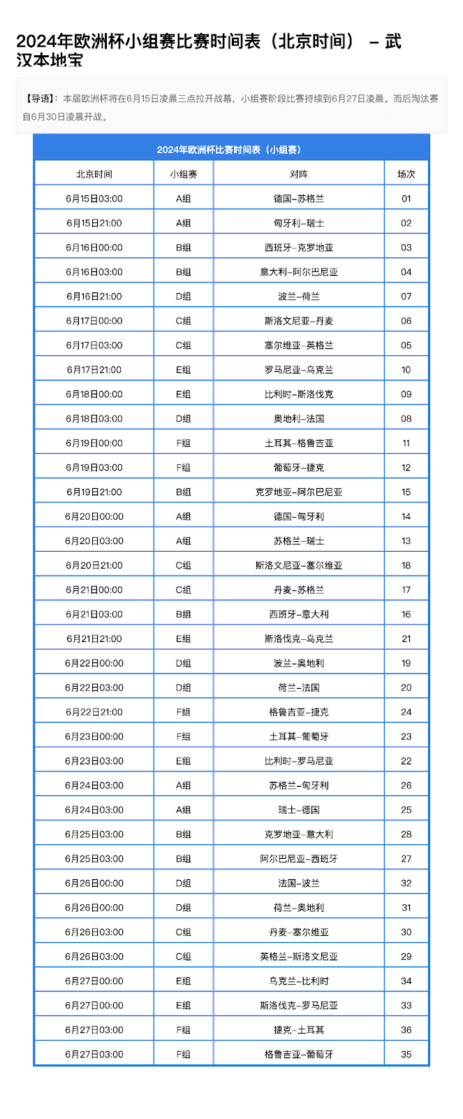 北京时间2024年6月15日03:00,由东道主德国队对阵苏格兰队在慕尼黑的安联球场进行。而决赛则将于当地时间 2024 年 7 月 14 日 21:00(北京时间 7 月 15 日 3:00),在柏林的柏林奥林匹克体育场开赛。