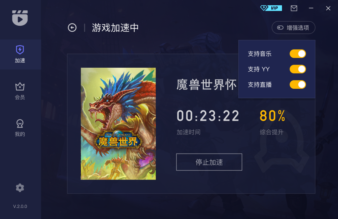 4、如果需要游戏和直播、YY、听歌等同时进行,可在游戏加速右上角点击「增强选项」,开启你需要的服务即可。