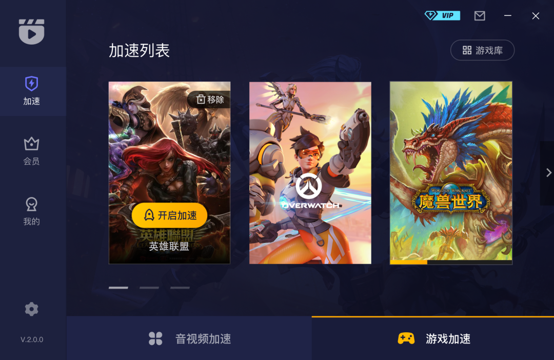 在游戏库中选择游戏或应用,现在支持的游戏有:英雄联盟、守望先锋、DNF-地下城与勇士、最终幻想14、魔兽世界、魔兽世界怀旧服、坦克世界、使命召唤OL……